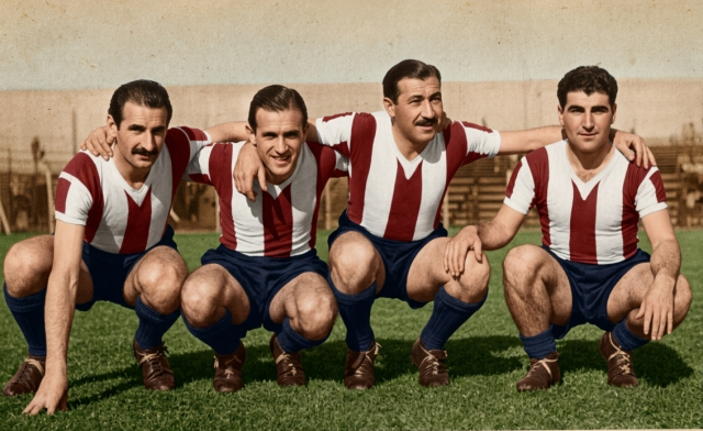 En la foto aparecen futbolistas de Talleres en la victoria 3-1 sobre Excursionistas de 1947. Fecha 6, 3 de mayo. De izquierda a derecha, Antonio Biniez,Vicente Ardura, Fortunato Temprano y Alberto Leonardo.